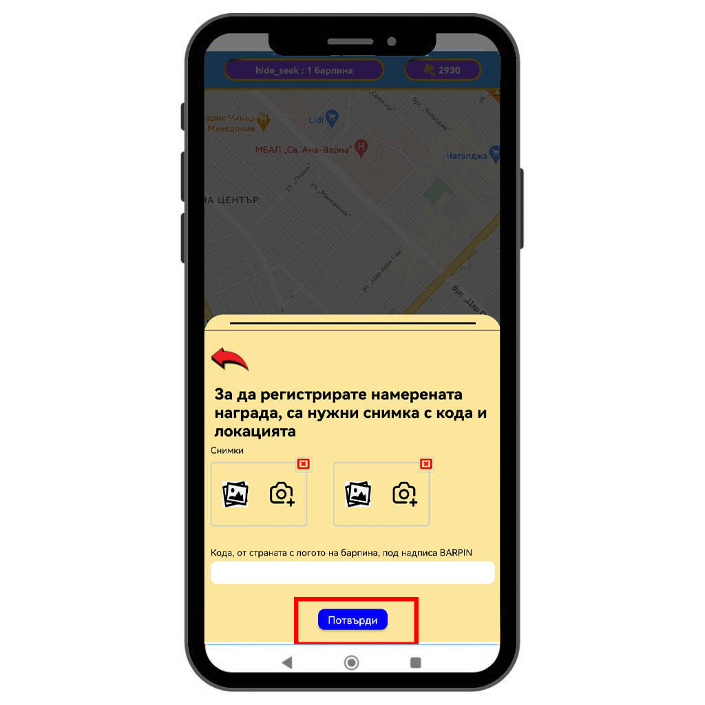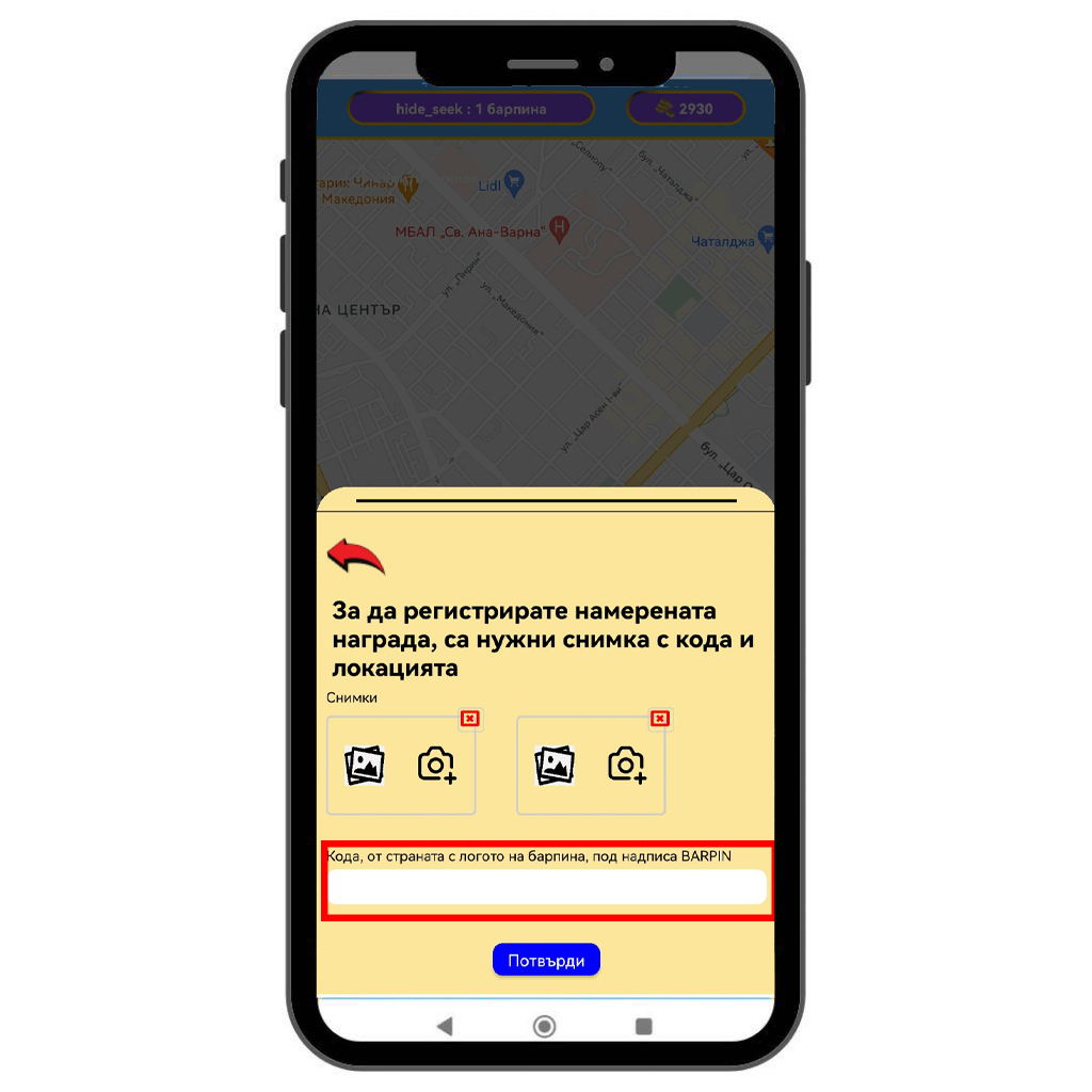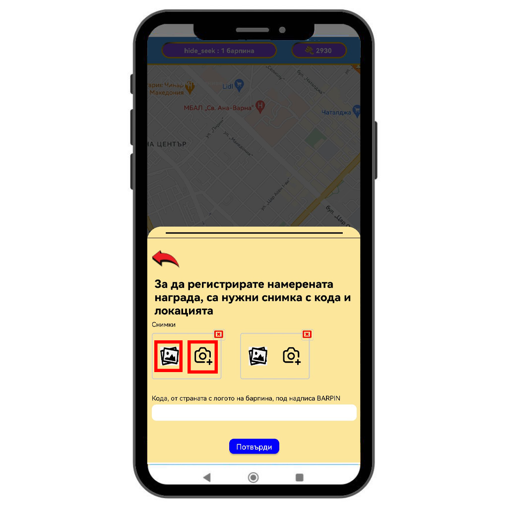 След потвърждаването се отваря меню, в което трябва да приложите снимки на намерения BarPin. Снимките могат да бъдат качени от галерията на телефона или да се направят директно с камерата.