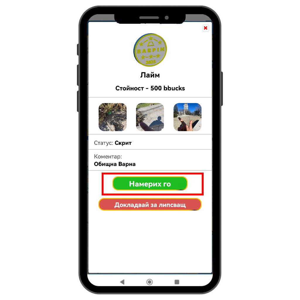 След като BarPin-а бъде одобрен, той се добавя към вашия акаунт. В зависимост от рядкостта на BarPin-a се добавя и определено количество bbucks. Маркерът на картата се променя – показва се маркерът за намерен BarPin, потвърден от играча, който го е поставил.