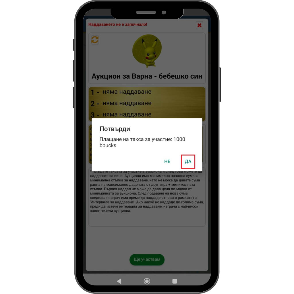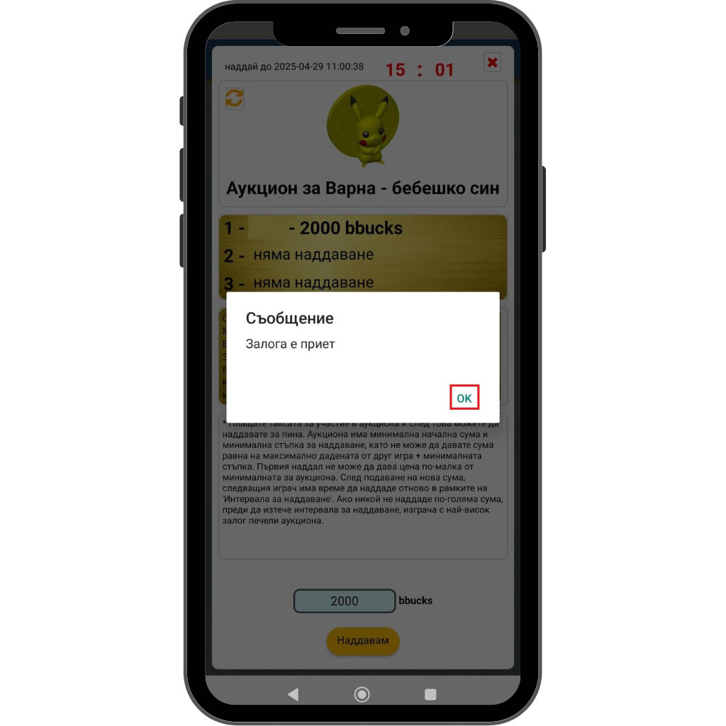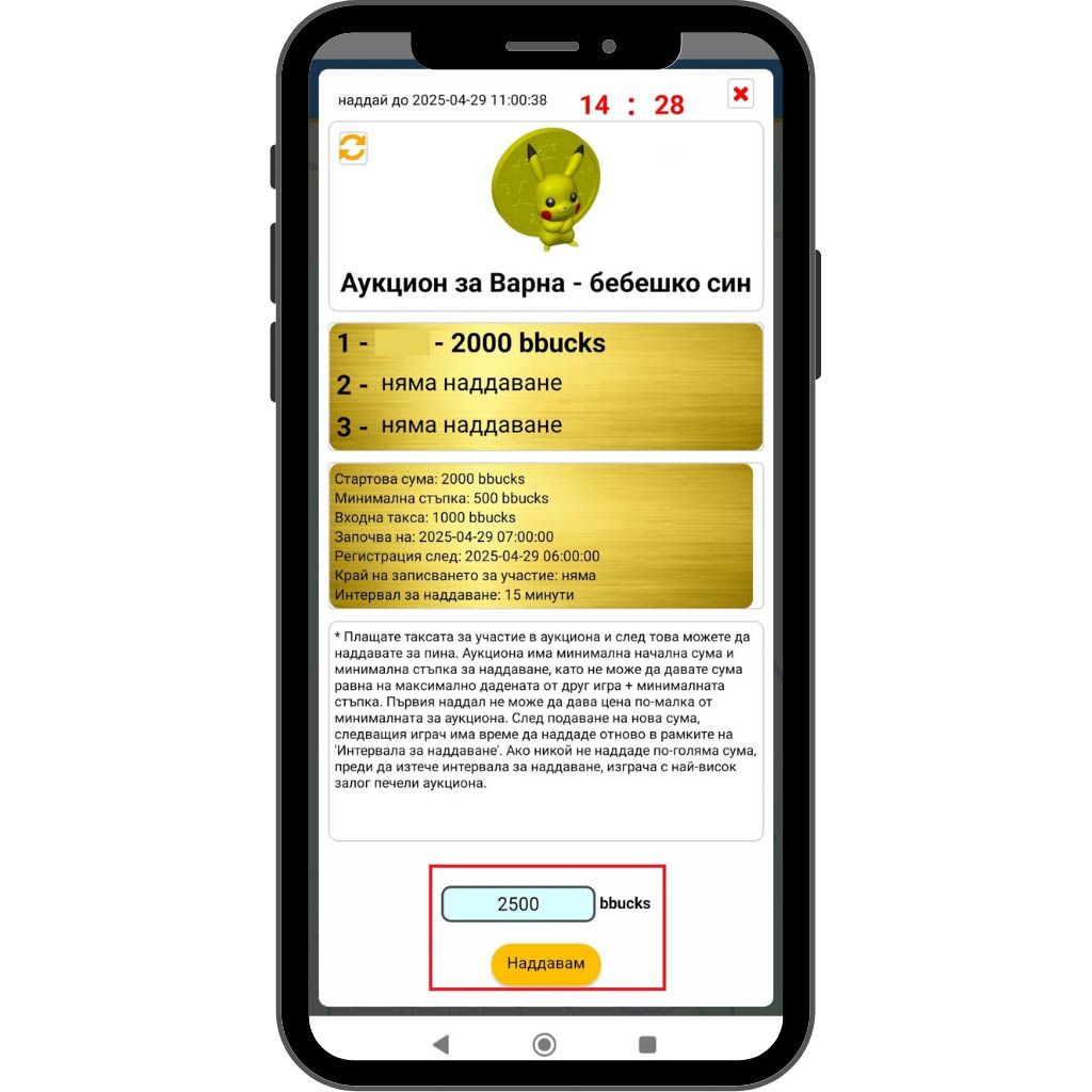 На екрана ще видите изведени тримата участници с най-високи залози до момента – това ви помага да прецените конкурентните оферти. Ако желаете да направите по-висока оферта, въведете желаната сума bbucks в полето в долната част на екрана, след което натиснете бутона „Наддавам“.