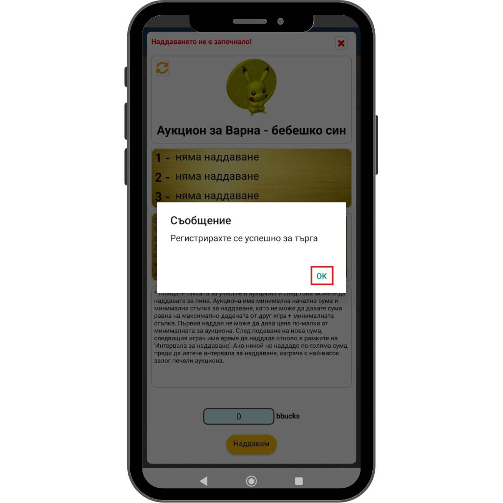 След като потвърдите участието си и таксата бъде начислена, ще видите съобщение за успешна регистрация за аукциона. Това означава, че вече официално сте включени в аукциона и имате право да наддавате. От този момент нататък ще можете да следите трите най-високи оферти и да подавате свои наддавания в рамките на зададеното време.