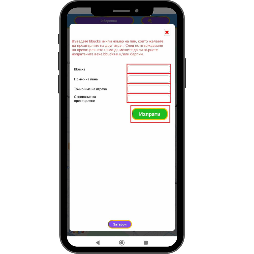 След потвърждаване на прехвърлянето няма да можете да си върнете изпратените вече bbucks-и и/или барпин.
