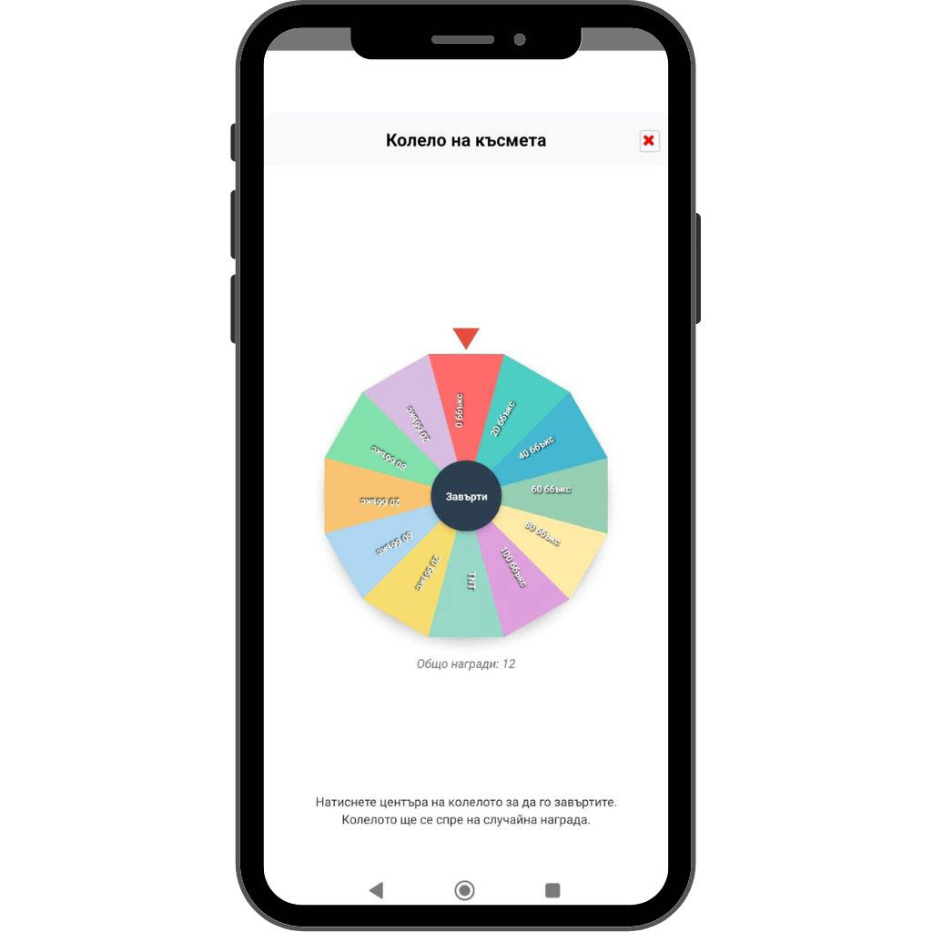 Бутонът „Колело на късмета“ предоставя възможност за участие в ежедневна игра с награди.