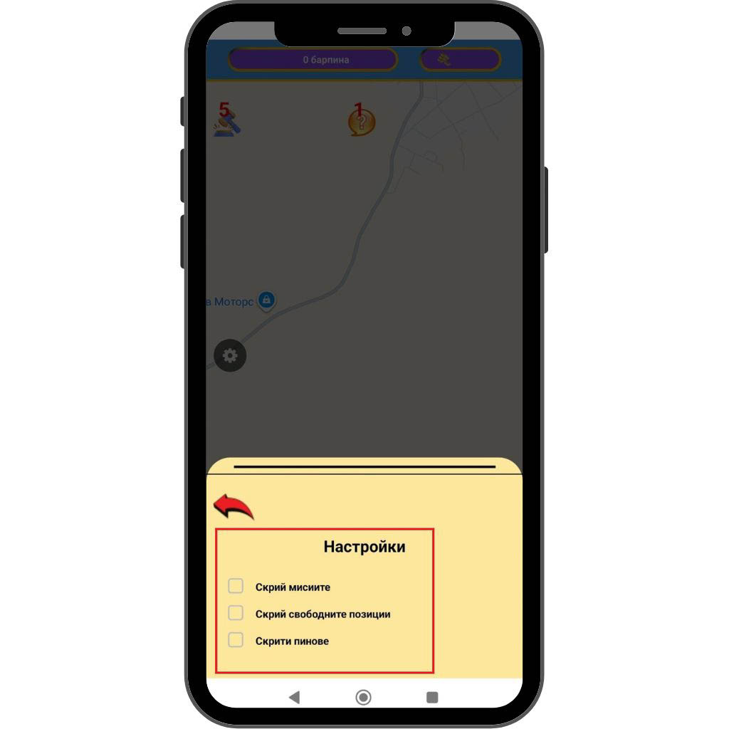 Чрез този бутон за настройки можете да управлявате видимостта на картата – да скривате маркерите на мисиите, свободните позиции и вече скритите пинове.